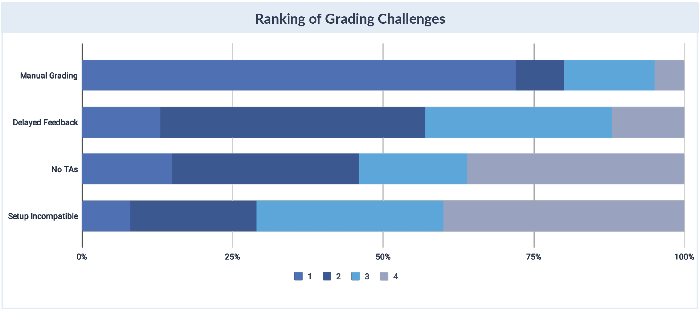 In terms of student feedback, manual grading was the highest priority pain point (72%)—ranked higher by those teaching at a smaller scale due to the lack of TA resources.