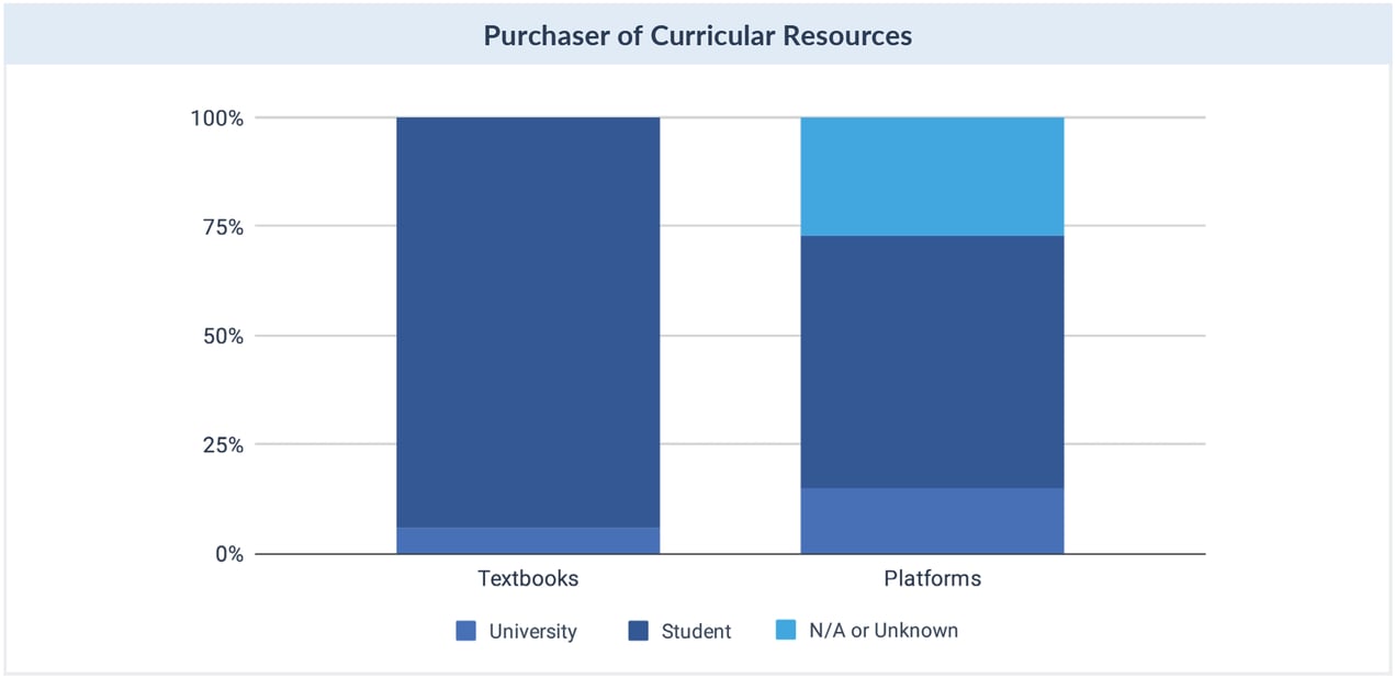Textbooks remain widely used. However, they are expensive, and the high cost can have a detrimental impact on student satisfaction. 94% of students are responsible for paying for their own textbooks. No teachers-at-scale reported that their institution covered the cost of their students’ textbooks. 58% of all respondents who use paid resources (whether in combination with OERs or not) said their students were responsible for covering the cost of “platforms that offer interactive textbooks.”