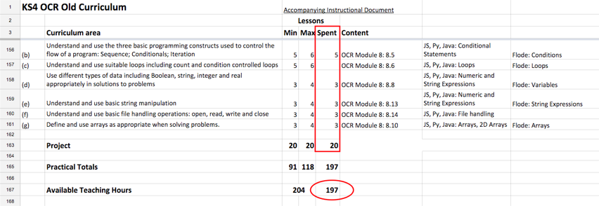 You can use the spreadsheet by entering time spent and planned for your lessons in Column E. The total amount of time is added up and shown in cell E167. This gives you the confidence to know that all curriculum areas are covered. See the accompanying Instructional Document to the Curriculum Map for further guidance. (The curriculum map outlines 2 years of GCSE Computing work with an expected 3 lesson per week and 34 weeks per year. There is a total of 204 lessons.)