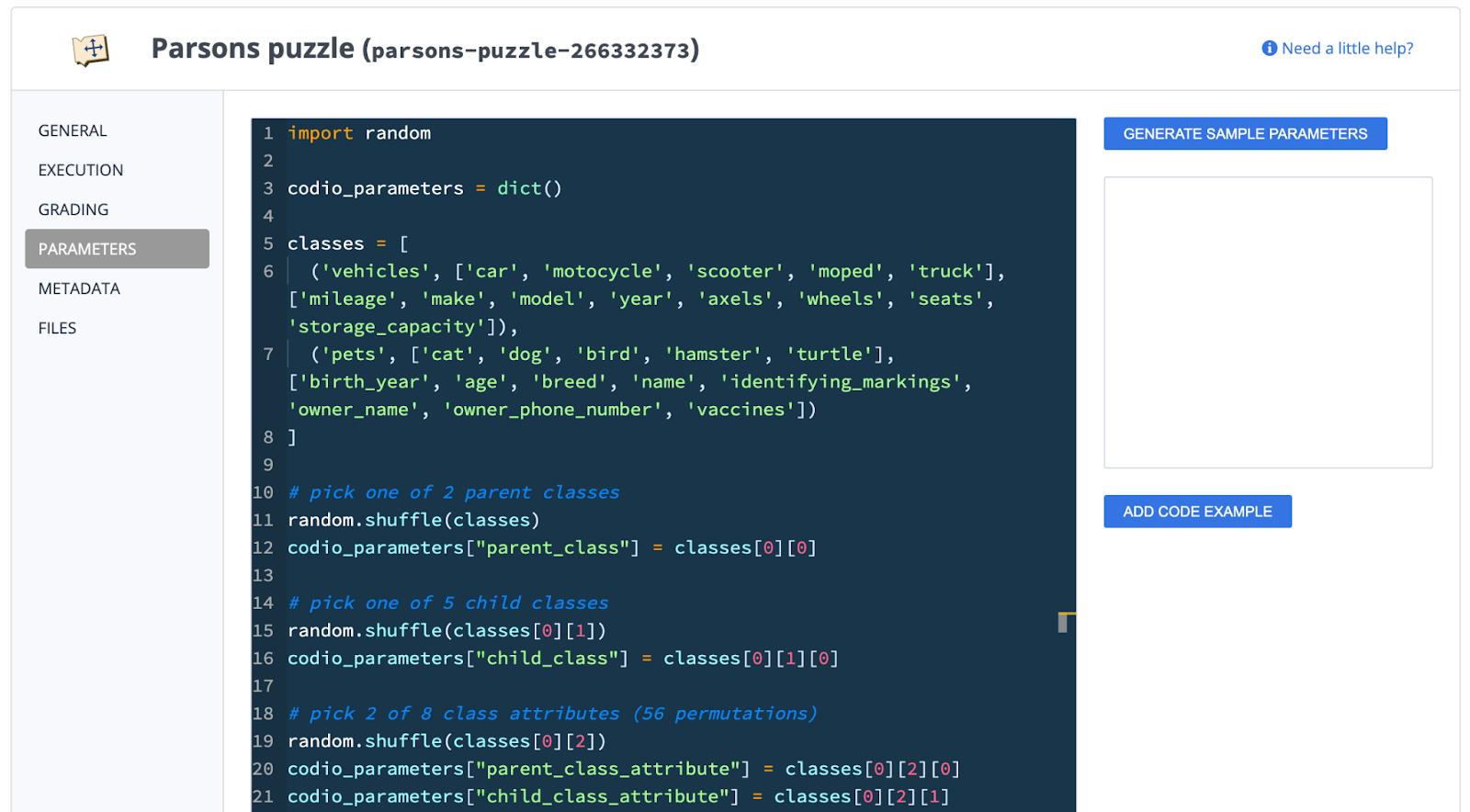 Parameterized assessments even work well with Parsons problems. We can use variables to randomize the names and attributes in a simple parent and child class: