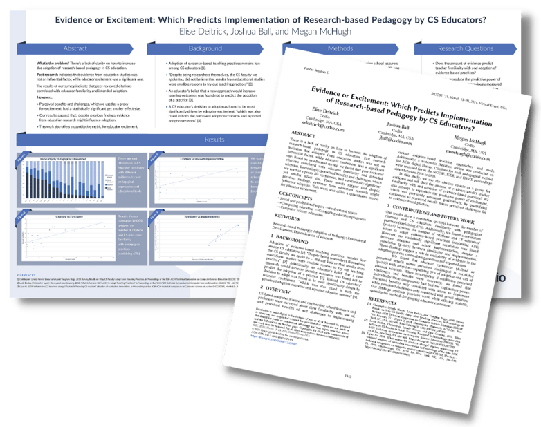 You can also view our peer-reviewed abstract and poster, “Evidence or Excitement: Which Predicts Implementation of Research-based Pedagogy by CS Educators?” by Elise Deitrick, Joshua Ball, and myself. Feel free to download the research poster and abstract here and share with colleagues!