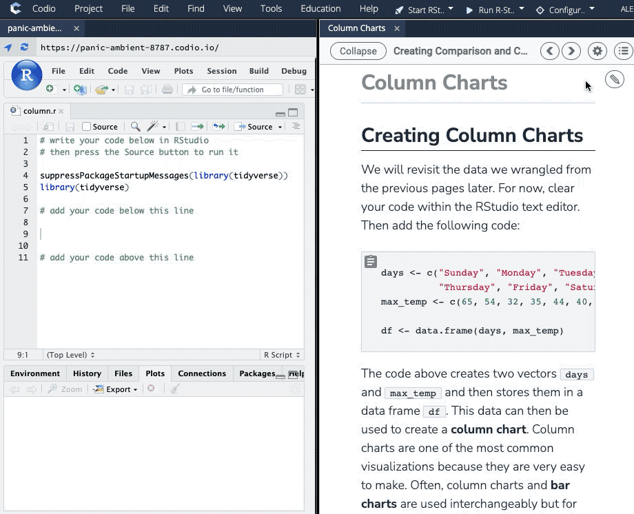 Essential Data Science in R emphasizes the importance of students applying and exploring the information presented. With Codio’s interactive interface, a code editor accompanies each page with new concepts. This way, students can actively see how the computer responds to code, rather than simply showing the end result. In addition, the course content provides code snippets that allow students to become familiar with the language, as well as suggested avenues for investigation.